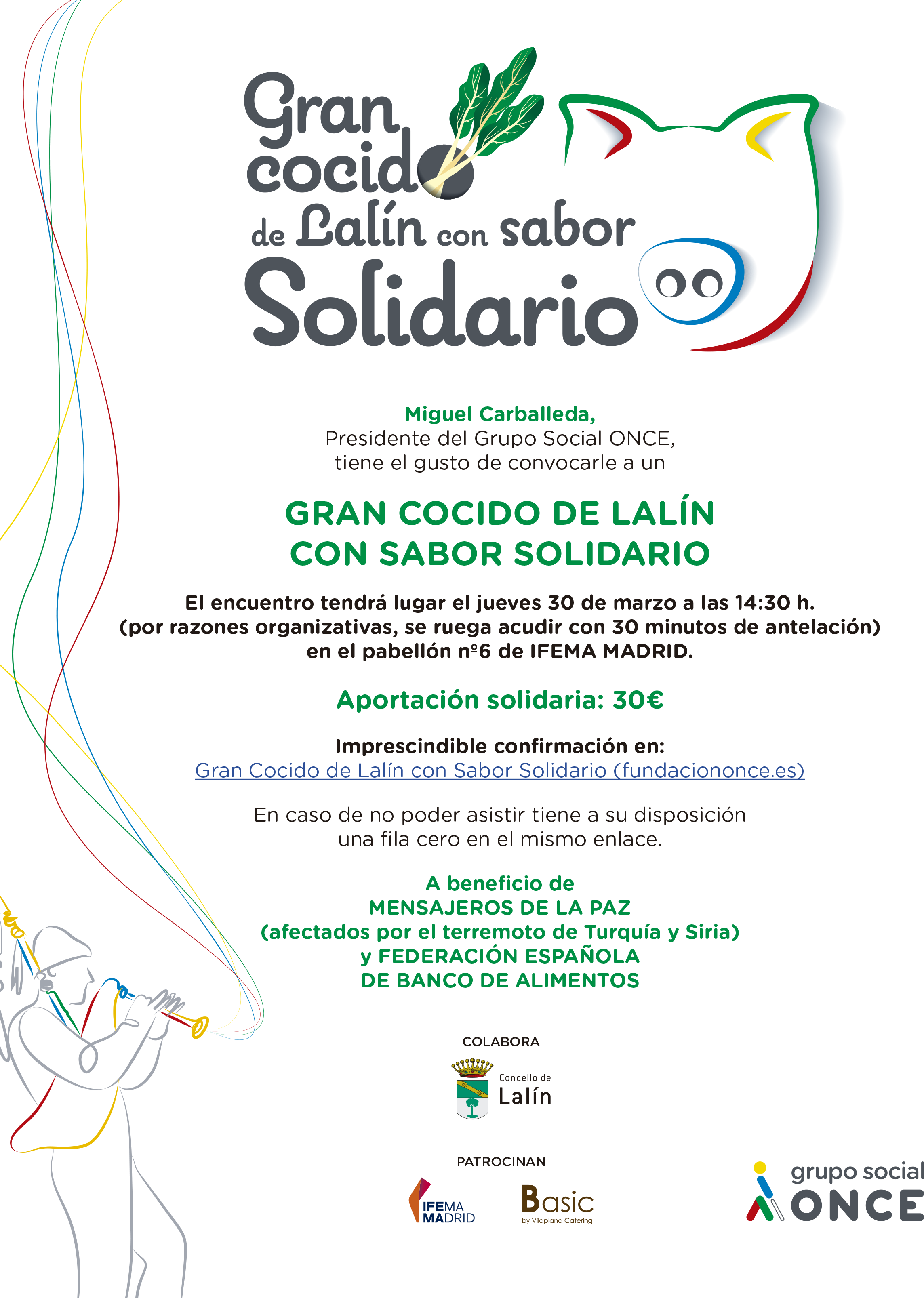 GRAN COCIDO DE LALÍN CON SABOR SOLIDARIO. El encuentro tendrá lugar el jueves 30 de marzo a las 14:30h. (por razones organizativas, se ruega acudir con 30 minutos de antelación) en el pabellón nº6 de IFEMA MADRID. Aportación solidaria: 30€. Imprescindible confirmación en: Gran Cocido de Lalín con Sabor Solidario (fundaciononce.es).