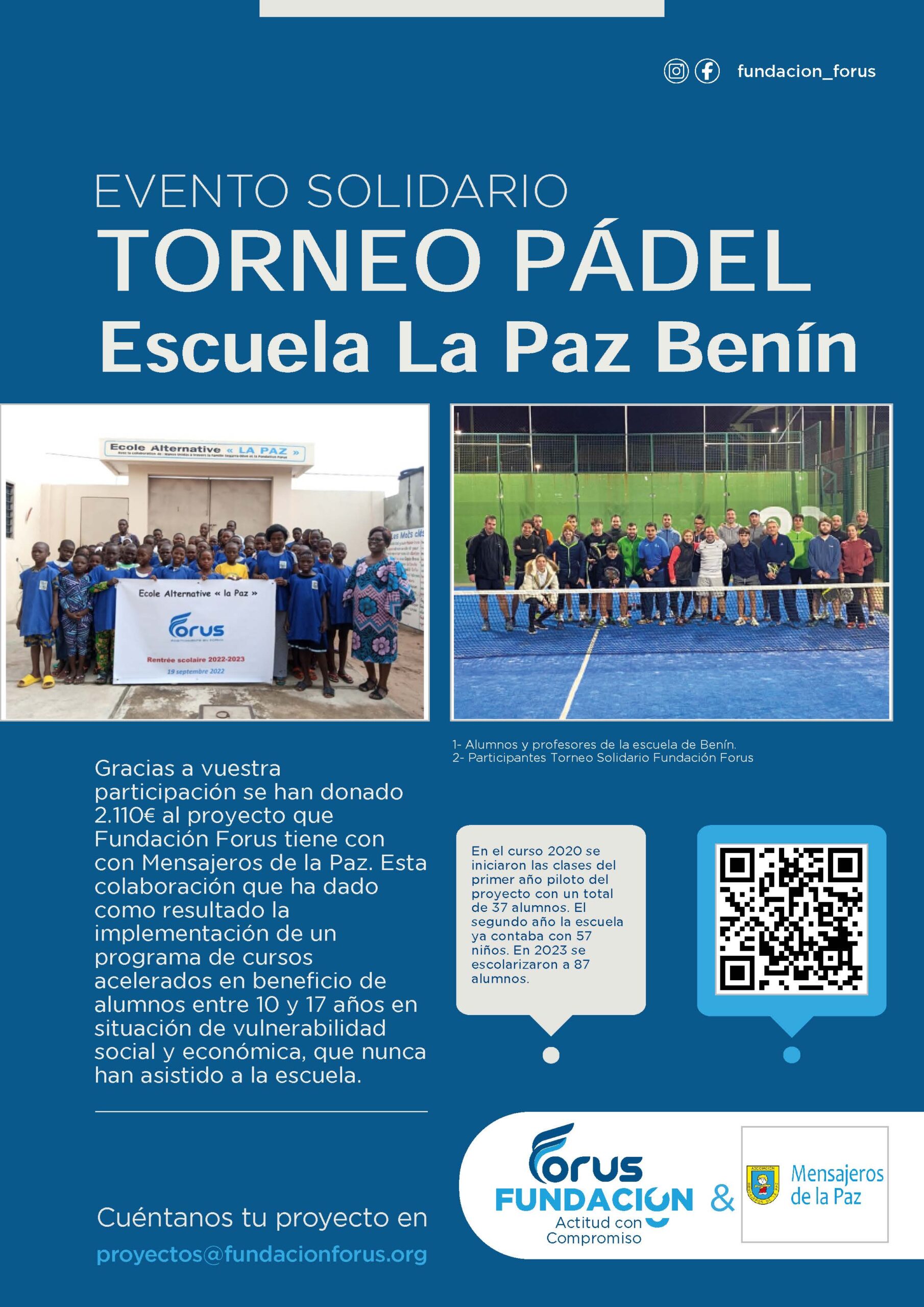 Gracias a la participación en este evento solidario se han recibido 2.110€ que irán destinados al proyecto Escuela de la Paz que tiene Mensajeros de la Paz en Benín y, en la que contamos con la ayuda, desde su inicio, de @fundacionforus. En esta escuela se imparten cursos acelerados en beneficio de alumnos entre 10 y 17 años en situación de vulnerabilidad social y económica, que nunca han asistido a la escuela. GRACIAS a todos los que habeis participado en este evento solidario en favor de los que poco o nada tienen.